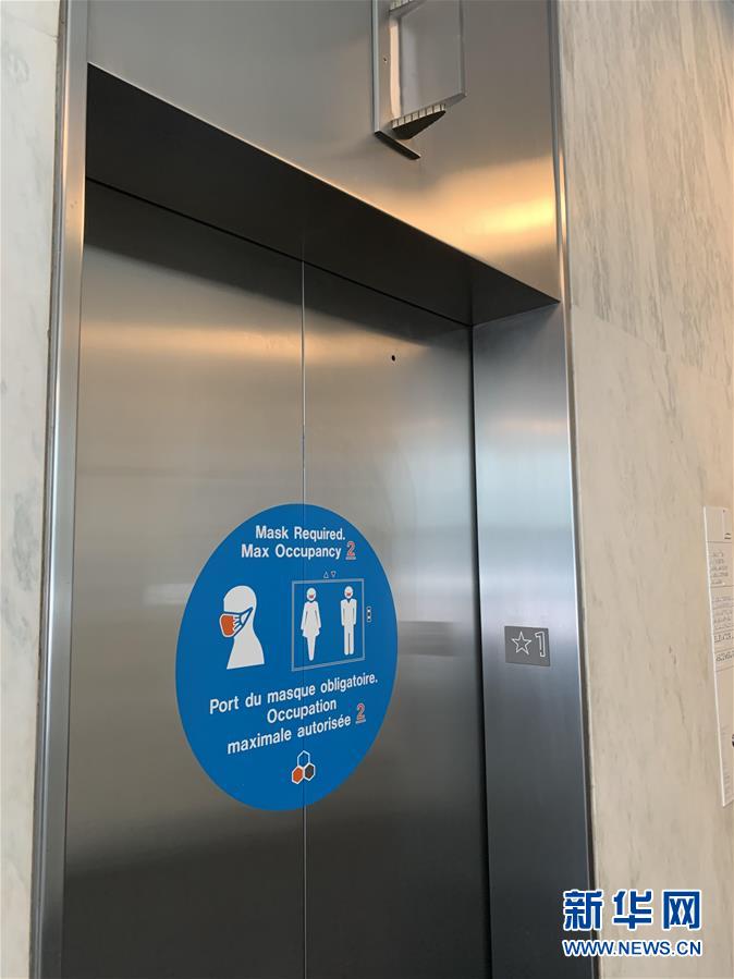 7月20日,在位于紐約的聯(lián)合國(guó)總部,電梯門上張貼著要求人們?cè)诠矆?chǎng)所佩戴口罩等標(biāo)識(shí)。受新冠疫情影響而實(shí)行遠(yuǎn)程辦公4個(gè)多月的紐約聯(lián)合國(guó)總部20日進(jìn)入重啟第一階段。按規(guī)定,該階段每天進(jìn)入總部大樓人數(shù)不能超過(guò)400人。新華社記者王建剛攝