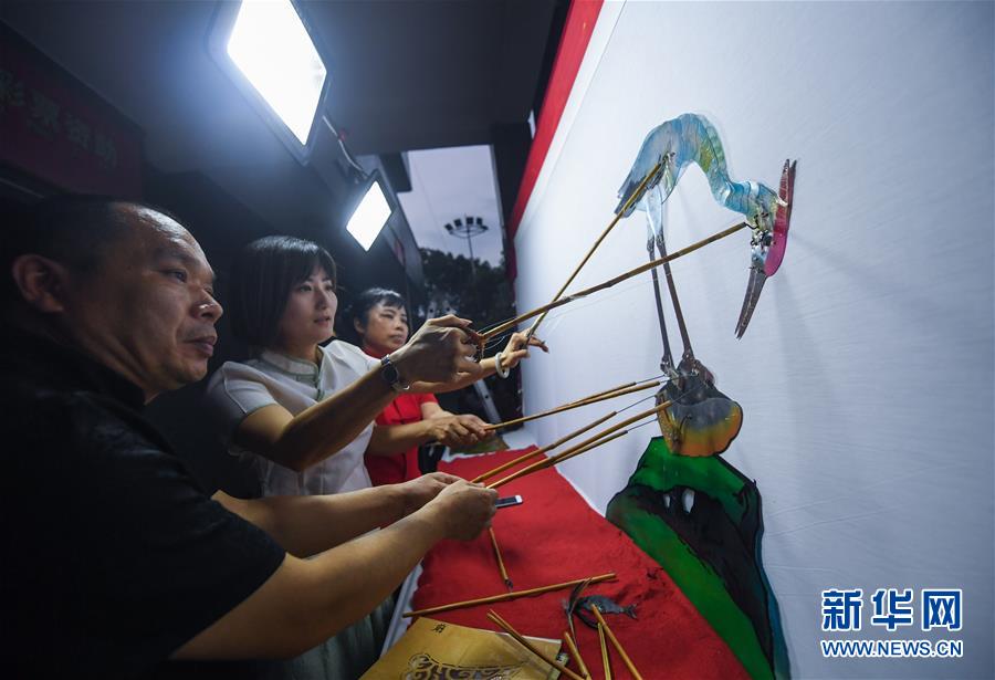 7月21日,“衛(wèi)家班皮影戲”劇團(tuán)的藝人們?cè)诤湍罉虼宓奈幕Y堂前為村民們上演傳統(tǒng)皮影戲《鷸蚌相爭(zhēng)漁人得利》。新華社記者徐昱攝