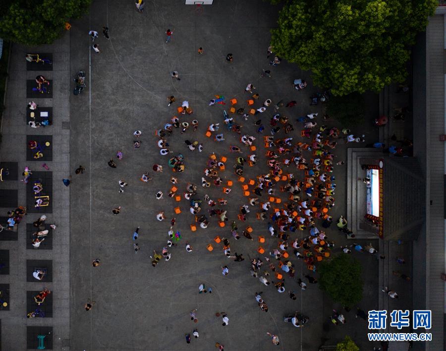 7月21日,“衛(wèi)家班皮影戲”劇團(tuán)的藝人們?cè)诤湍罉虼宓奈幕Y堂前為村民們上演傳統(tǒng)皮影戲,豐富鄉(xiāng)村百姓夏季文化生活(無(wú)人機(jī)照片)。新華社記者徐昱攝