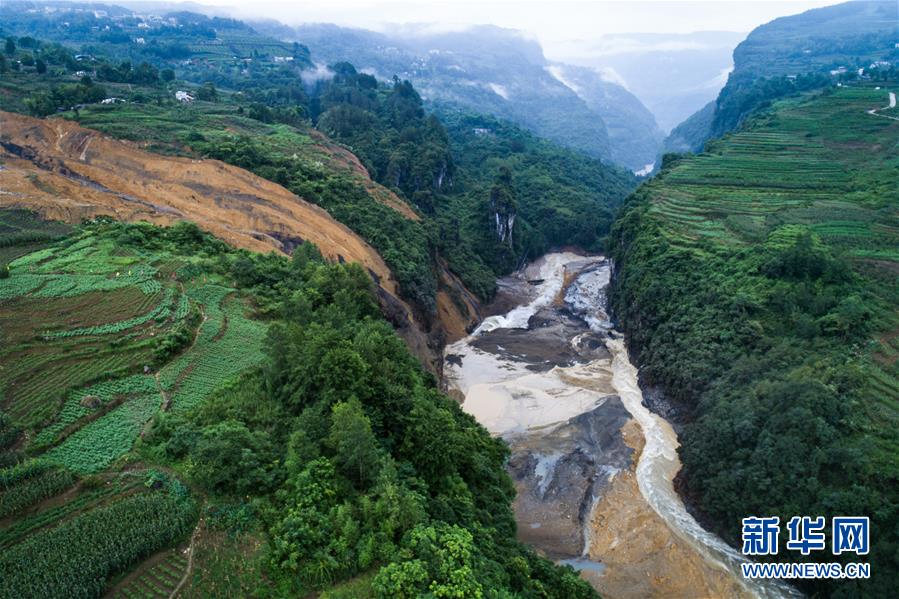 7月22日拍攝的因恩施州屯堡鄉(xiāng)馬者村山體滑坡形成的堰塞湖(無人機照片)。新華社記者肖藝九攝