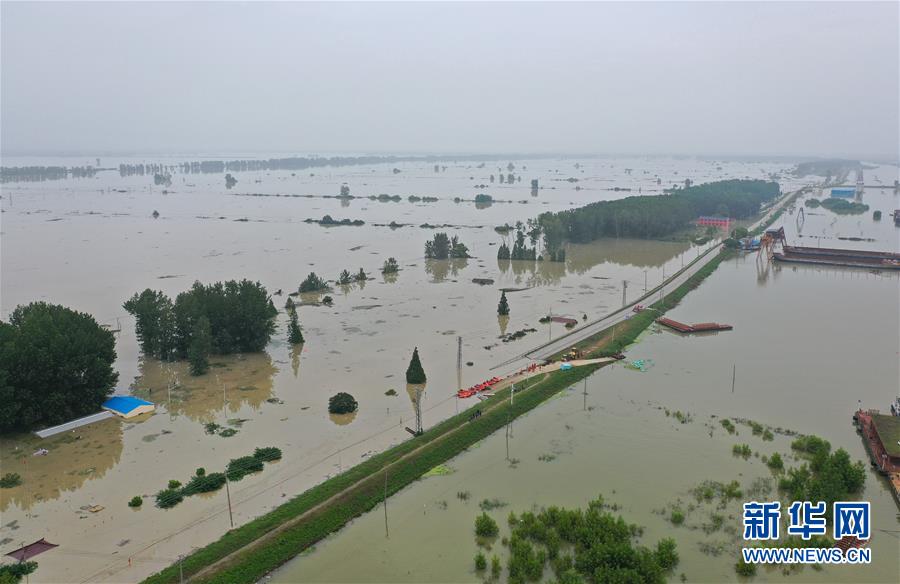 這是7月21日拍攝的被淹的南京市高淳區(qū)陽江鎮(zhèn)勝利圩(畫面左側(cè))(無人機照片)。新華社記者季春鵬攝