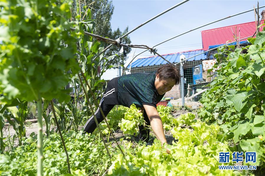 7月23日,在黑龍江省撫遠市濃橋鎮(zhèn)東方紅村,康麗艷在自家庭院中摘菜。新華社記者 謝劍飛 攝