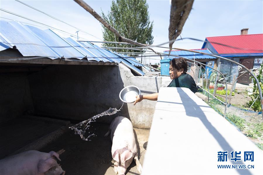7月23日,在黑龍江省撫遠市濃橋鎮(zhèn)東方紅村,康麗艷在給鴨和鵝準備飲用水。新華社記者 謝劍飛 攝