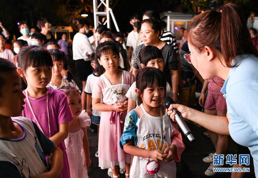 7月23日晚,在成都市成華區(qū)望平街濱河路的天府文創(chuàng)大集市上,參加讀書活動(dòng)的小朋友在介紹自己閱讀過(guò)的童話故事。新華社記者 王曦 攝