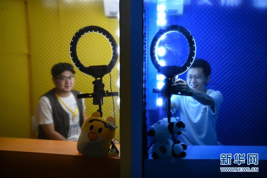 7月23日晚在成都市成華區(qū)望平街濱河路的天府文創(chuàng)大集市上拍攝的“共享直播間”。新華社記者 王曦 攝