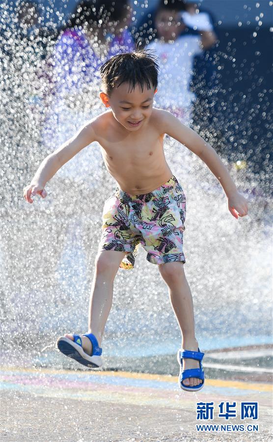 7月24日,一名小男孩在北京華熙LIVE·五棵松商業(yè)街區(qū)的一處噴泉戲水。北京市氣象局7月24日傍晚發(fā)布稱,24日截至16時30分,平原大部分地區(qū)出現(xiàn)37℃以上高溫天氣,局地氣溫超過40℃。北京市已于23日發(fā)布高溫藍色預警,預計25日全市大部分地區(qū)日最高氣溫仍將達35℃以上。新華社記者陳曄華攝