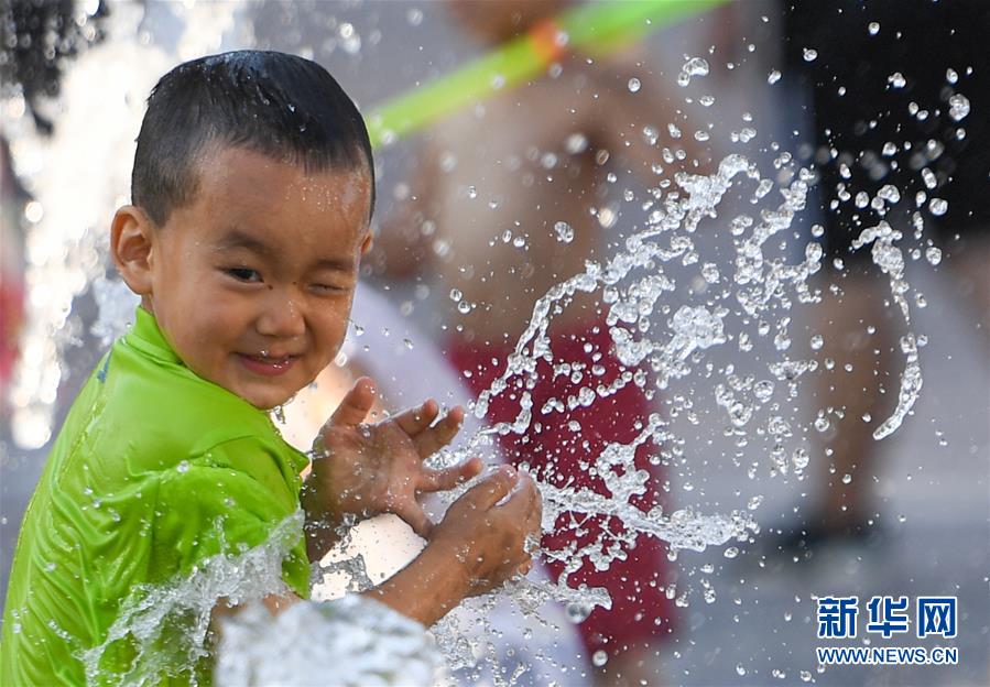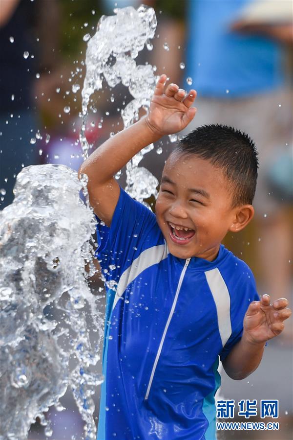 7月24日,一名小男孩在北京華熙LIVE·五棵松商業(yè)街區(qū)的一處噴泉戲水。北京市氣象局7月24日傍晚發(fā)布稱,24日截至16時30分,平原大部分地區(qū)出現(xiàn)37℃以上高溫天氣,局地氣溫超過40℃。北京市已于23日發(fā)布高溫藍色預警,預計25日全市大部分地區(qū)日最高氣溫仍將達35℃以上。新華社記者陳曄華攝