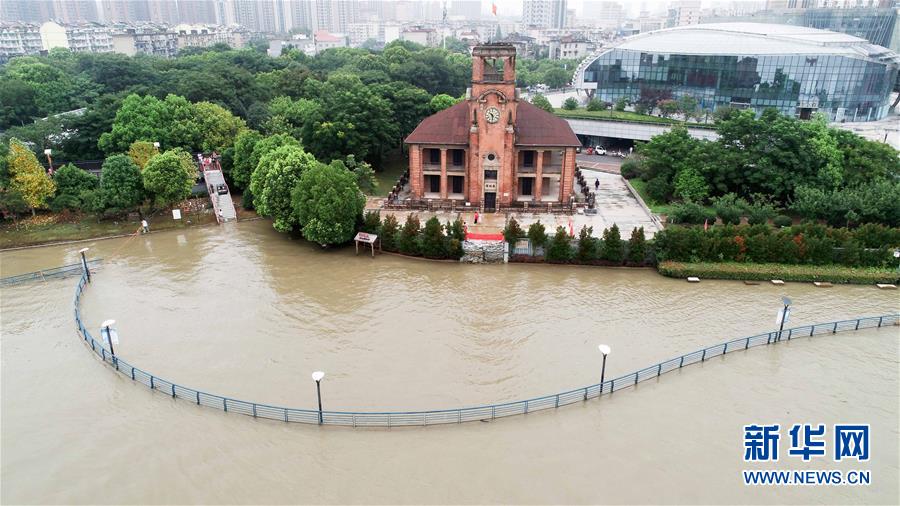 蕪湖市標志性建筑之一老海關(guān)前的觀景平臺已被江水淹沒(7月25日攝,無人機照片)。新華社記者 曹力 攝