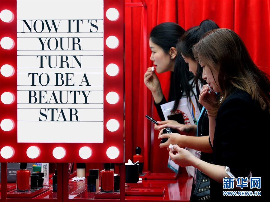 在第二屆進博會品質(zhì)生活展區(qū),觀眾在歐萊雅旗下品牌彩妝展臺試用口紅(2019年11月6日攝)新華社記者 劉穎 攝