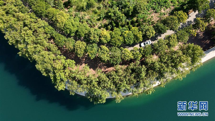 7月26日,汽車行駛在欒卸村的樹林里(無人機照片)。盛夏,位于太行山區(qū)的河北省沙河市欒卸村滿目蔥蘢,山水、田園、民居構(gòu)成一幅美麗鄉(xiāng)村圖景。新華社記者 牟宇 攝