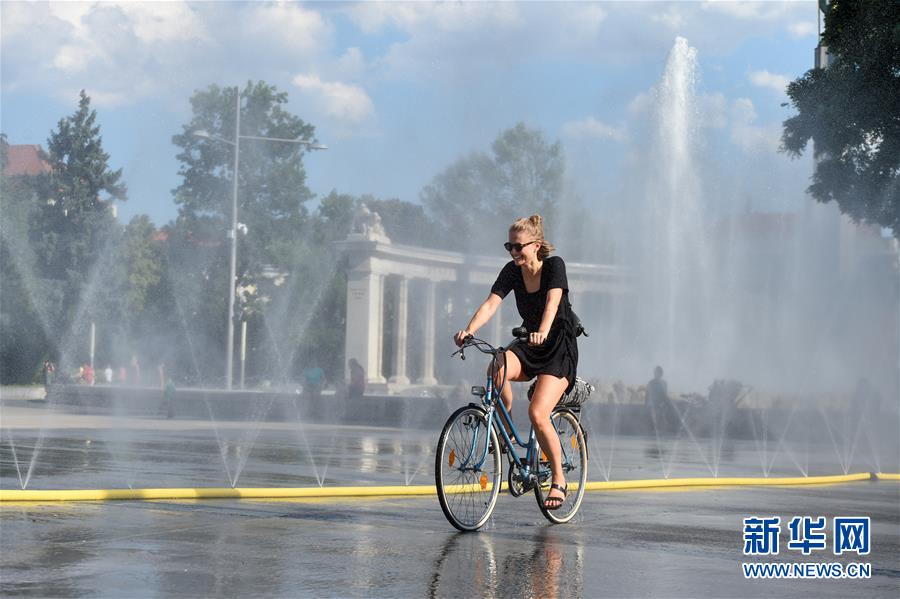 7月28日,在奧地利維也納,一名女子騎車經(jīng)過一處廣場的噴水設施。當日,維也納市中心的最高氣溫達到37.2攝氏度,不少市民戲水消暑。新華社記者郭晨攝