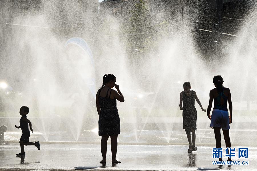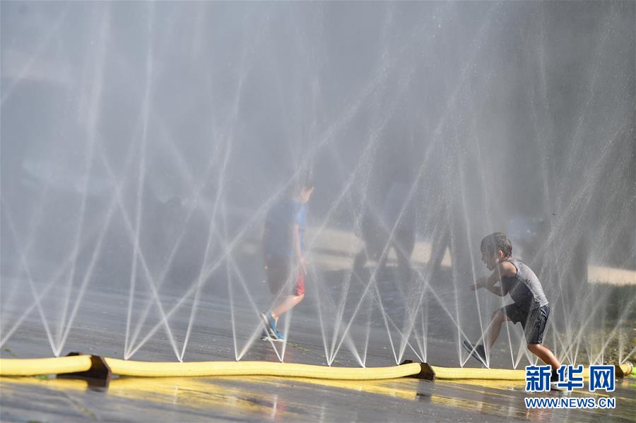 7月28日,在奧地利維也納,兒童在一處廣場(chǎng)戲水。新華社記者郭晨攝