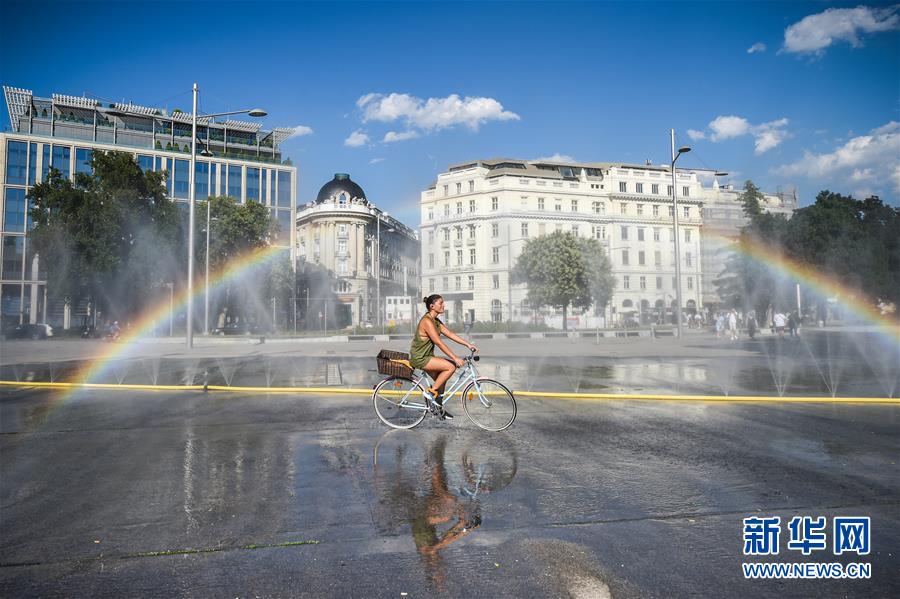 7月28日,在奧地利維也納,一名女子騎車經(jīng)過一處廣場(chǎng)的噴水設(shè)施。新華社記者郭晨攝