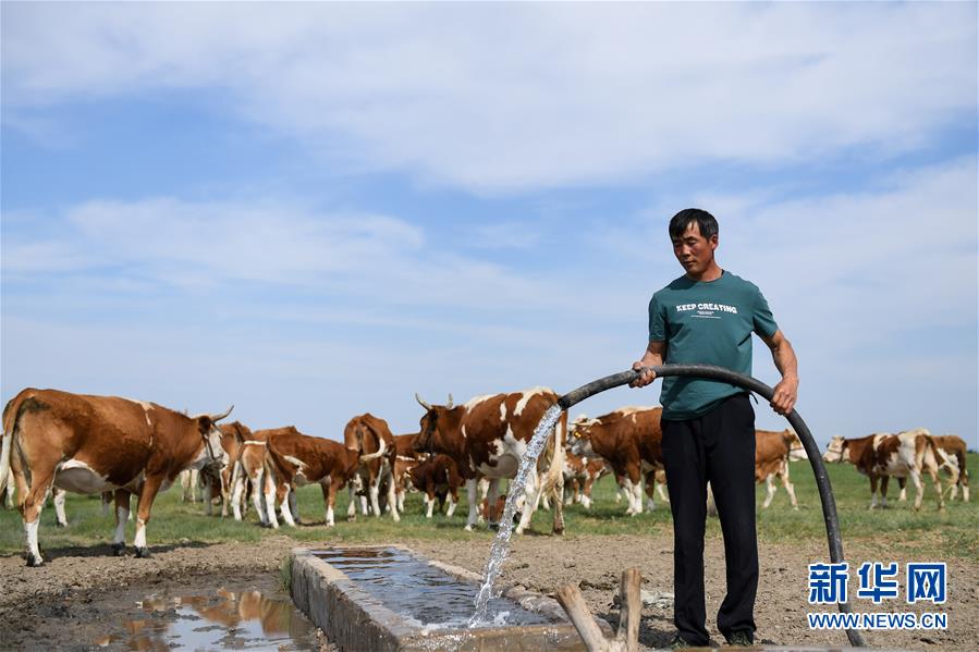 呼格吉勒在自家的牧場飲牛(7月23日攝)。