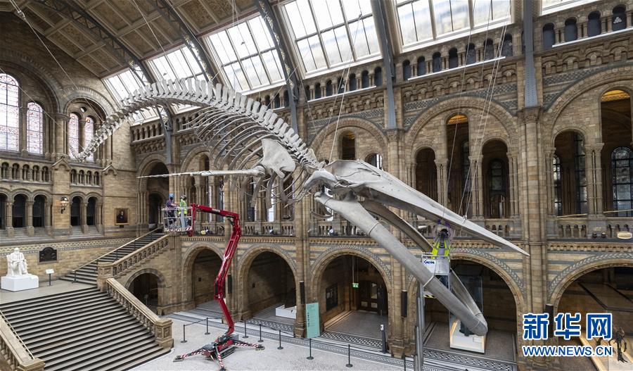 7月27日,工作人員在英國(guó)倫敦的自然歷史博物館大廳內(nèi)清潔一具藍(lán)鯨骨架。受新冠疫情影響關(guān)閉數(shù)月的英國(guó)自然歷史博物館將于8月5日重新對(duì)外開(kāi)放,目前館方正在為重新開(kāi)放做最后準(zhǔn)備。參觀者需要提前預(yù)約參觀時(shí)段、全程佩戴口罩且保持安全距離。新華社記者韓巖攝
