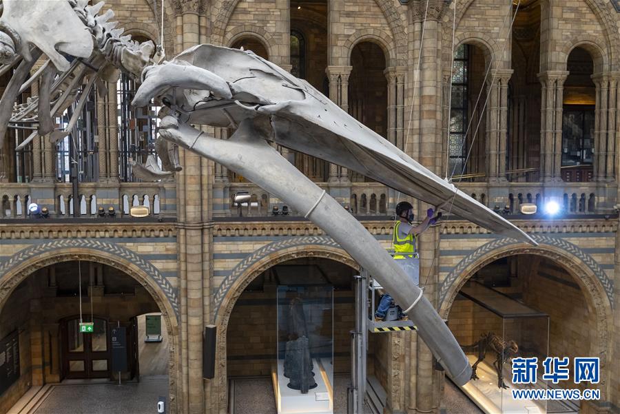 7月27日,工作人員在英國倫敦的自然歷史博物館大廳內(nèi)清潔一具藍鯨骨架。受新冠疫情影響關(guān)閉數(shù)月的英國自然歷史博物館將于8月5日重新對外開放,目前館方正在為重新開放做最后準備。參觀者需要提前預(yù)約參觀時段、全程佩戴口罩且保持安全距離。新華社記者韓巖攝