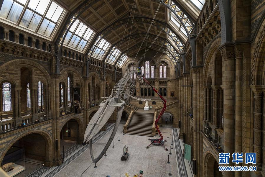 7月27日,工作人員在英國(guó)倫敦的自然歷史博物館大廳內(nèi)清潔一具藍(lán)鯨骨架。受新冠疫情影響關(guān)閉數(shù)月的英國(guó)自然歷史博物館將于8月5日重新對(duì)外開放,目前館方正在為重新開放做最后準(zhǔn)備。參觀者需要提前預(yù)約參觀時(shí)段、全程佩戴口罩且保持安全距離。新華社記者韓巖攝