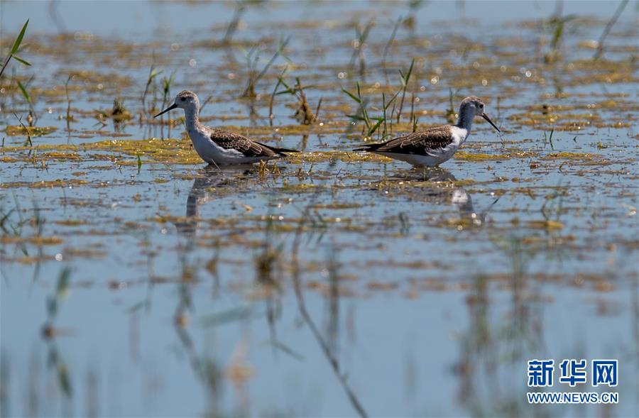 7月28日,兩只長(zhǎng)腳鷸在桃力廟—阿拉善灣海子覓食。鄂爾多斯?jié)竦匚挥趲?kù)布齊沙漠、毛烏素沙地接壤地帶,2002年被列入國(guó)際重要濕地名錄。從2006年開始,由于濕地湖面萎縮、湖心島消失,在此筑巢繁殖的世界瀕危物種遺鷗幾近消失。近年來,當(dāng)?shù)夭扇《喾N治理措施,濕地生態(tài)環(huán)境逐步好轉(zhuǎn)。2019年起,濕地內(nèi)的桃力廟—阿拉善灣海子迎來遺鷗大規(guī)模“回歸”。如今,40多種鳥類在此棲息,鄂爾多斯?jié)竦刂匦鲁蔀轼B類的樂園。新華社記者連振攝