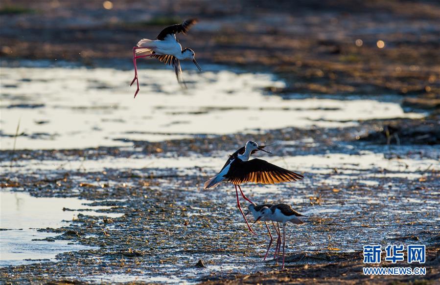 7月28日,長(zhǎng)腳鷸在桃力廟—阿拉善灣海子覓食。鄂爾多斯?jié)竦匚挥趲?kù)布齊沙漠、毛烏素沙地接壤地帶,2002年被列入國(guó)際重要濕地名錄。從2006年開始,由于濕地湖面萎縮、湖心島消失,在此筑巢繁殖的世界瀕危物種遺鷗幾近消失。近年來,當(dāng)?shù)夭扇《喾N治理措施,濕地生態(tài)環(huán)境逐步好轉(zhuǎn)。2019年起,濕地內(nèi)的桃力廟—阿拉善灣海子迎來遺鷗大規(guī)?!盎貧w”。如今,40多種鳥類在此棲息,鄂爾多斯?jié)竦刂匦鲁蔀轼B類的樂園。新華社記者連振攝