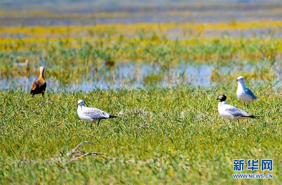 7月28日,灰雁和遺鷗在桃力廟—阿拉善灣海子覓食。鄂爾多斯?jié)竦匚挥趲?kù)布齊沙漠、毛烏素沙地接壤地帶,2002年被列入國(guó)際重要濕地名錄。從2006年開始,由于濕地湖面萎縮、湖心島消失,在此筑巢繁殖的世界瀕危物種遺鷗幾近消失。近年來,當(dāng)?shù)夭扇《喾N治理措施,濕地生態(tài)環(huán)境逐步好轉(zhuǎn)。2019年起,濕地內(nèi)的桃力廟—阿拉善灣海子迎來遺鷗大規(guī)?!盎貧w”。如今,40多種鳥類在此棲息,鄂爾多斯?jié)竦刂匦鲁蔀轼B類的樂園。新華社記者彭源攝