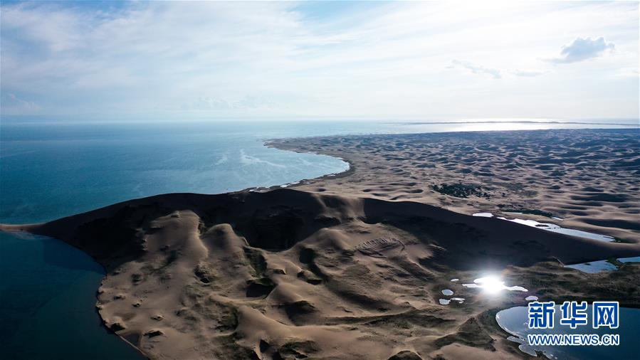 這是7月28日拍攝的青海湖沙島一隅(無人機照片)。盛夏傍晚,位于青海湖東北部的沙島,島內湖泊星羅棋布,沙丘連綿起伏,風景別致。金沙與湖水掩映,在陽光的勾勒下形成一幅美麗的畫卷。新華社記者吳剛攝