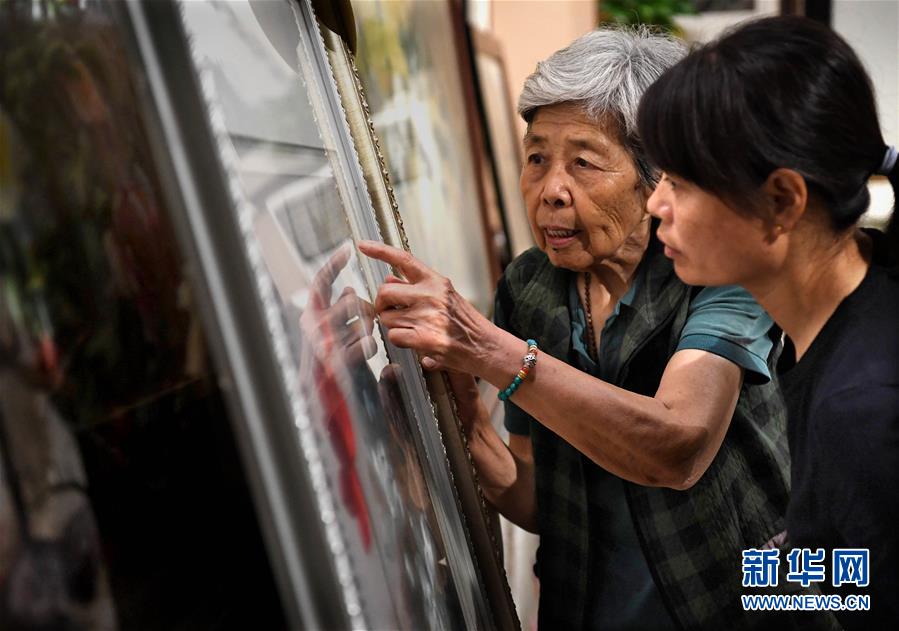 在開(kāi)封市素花宋繡工藝有限公司的展示館里,王素花向徒弟劉冬紅講解刺繡作品上的難點(diǎn)(7月30日攝)。新華社記者李安攝
