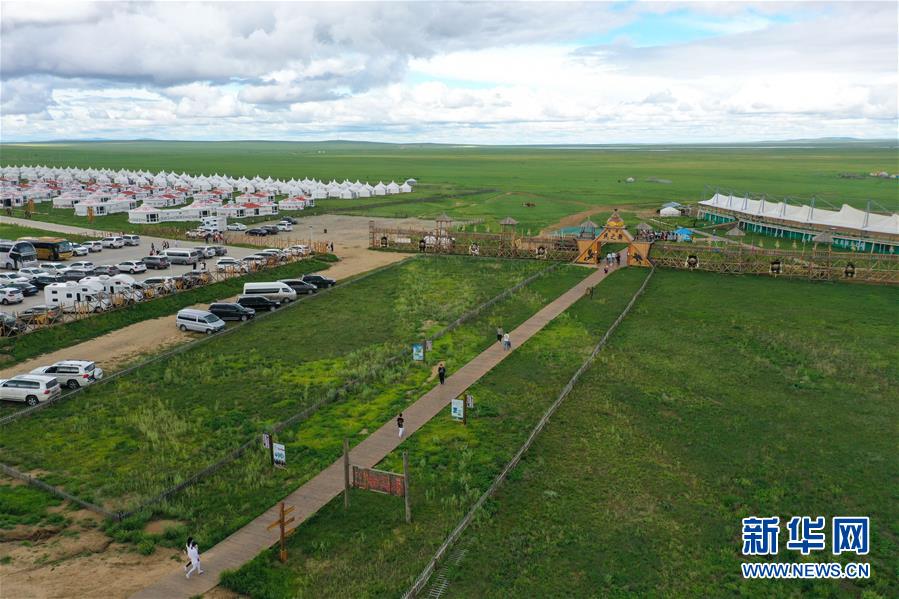 8月4日,游客在呼倫貝爾新巴爾虎左旗的民俗旅游度假景區(qū)游玩(無人機(jī)照片)。今年暑期,內(nèi)蒙古呼倫貝爾通過暫行周末2.5天彈性休假工作制度,發(fā)放旅游、餐飲消費(fèi)券,景區(qū)推出優(yōu)惠促銷活動(dòng)等措施,提振當(dāng)?shù)芈糜问袌?。新華社記者徐欽攝