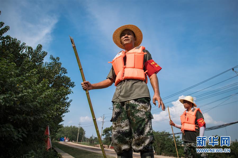 8月5日,夏德勤(左)與同事在長(zhǎng)江武金堤上。新華社記者肖藝九攝