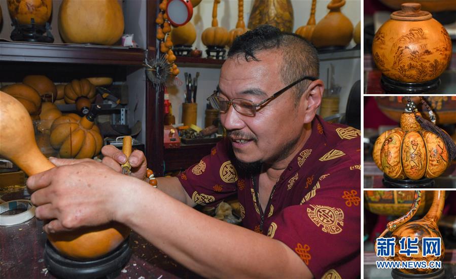 8月5日,侯景偉挑選適合創(chuàng)作的葫蘆。今年55歲的吉林四平人侯景偉自幼與家人學(xué)習(xí)雕刻、烙畫(huà)藝術(shù)。經(jīng)過(guò)多年潛心研究,他將浮雕和烙畫(huà)工藝相結(jié)合,通過(guò)拋光、起稿、雕刻、烙燙、套色等十余道工藝,制作展現(xiàn)傳統(tǒng)文化、民俗故事的葫蘆工藝品。2020年,侯景偉被評(píng)為四平市非物質(zhì)文化遺產(chǎn)項(xiàng)目侯氏葫蘆雕刻烙畫(huà)代表性傳承人。他說(shuō):“希望有更多人加入到非遺傳承隊(duì)伍中,讓小葫蘆‘講’出更多民俗故事。”新華社記者張楠攝