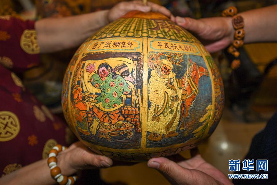 這是侯景偉創(chuàng)作的民俗主題葫蘆工藝品(8月5日攝)。今年55歲的吉林四平人侯景偉自幼與家人學(xué)習(xí)雕刻、烙畫藝術(shù)。經(jīng)過多年潛心研究,他將浮雕和烙畫工藝相結(jié)合,通過拋光、起稿、雕刻、烙燙、套色等十余道工藝,制作展現(xiàn)傳統(tǒng)文化、民俗故事的葫蘆工藝品。2020年,侯景偉被評(píng)為四平市非物質(zhì)文化遺產(chǎn)項(xiàng)目侯氏葫蘆雕刻烙畫代表性傳承人。他說:“希望有更多人加入到非遺傳承隊(duì)伍中,讓小葫蘆‘講’出更多民俗故事。”新華社記者張楠攝