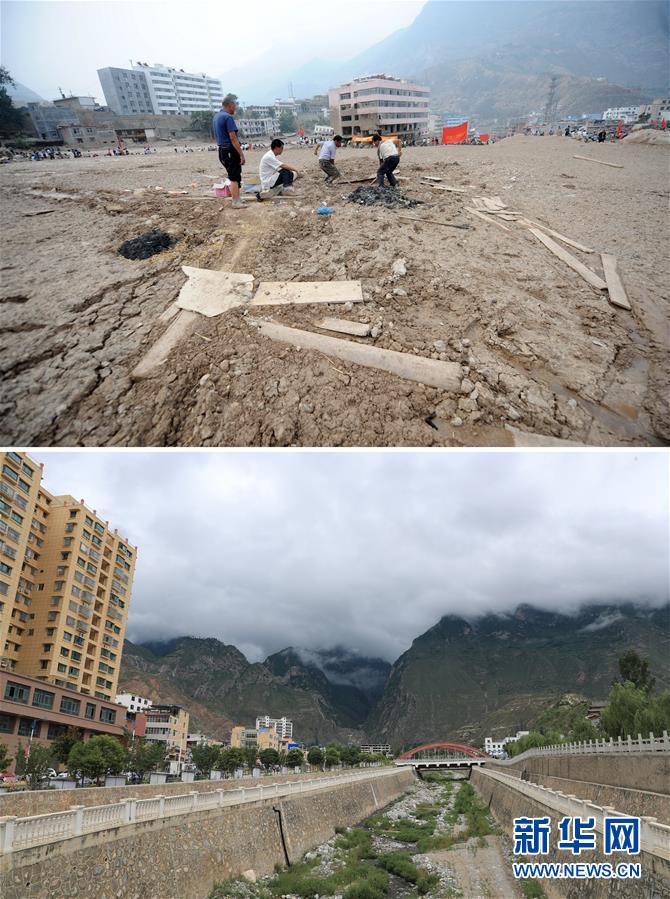 拼版照片:上圖為2010年8月11日,當(dāng)?shù)厝罕娫谥矍h月圓村的泥石中搜救被埋人員(新華社記者聶建江攝);下圖為2020年7月14日拍攝的月圓村山洪泥石流排導(dǎo)渠(新華社記者杜哲宇攝)。新華社發(fā)