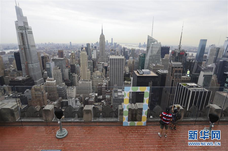 8月6日,在美國紐約,人們在洛克菲勒中心觀景臺上觀看城市景觀。當(dāng)日,3月份暫時(shí)關(guān)閉的洛克菲勒中心觀景臺恢復(fù)對公眾開放。每天13時(shí)至21時(shí),人們可戴口罩前往參觀。新華社記者王迎攝