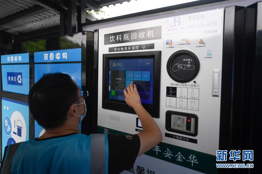 網(wǎng)格員在金華市金東區(qū)東孝街道一處垃圾分類投放點(diǎn)操作飲料瓶回收機(jī)(7月16日攝)。近年來,浙江省通過創(chuàng)新宣傳教育,多措并舉促進(jìn)垃圾分類投放、收運(yùn)及處置的良性循環(huán),引領(lǐng)垃圾分類成為城鄉(xiāng)居民的生活新風(fēng)尚。新華社記者黃宗治攝。