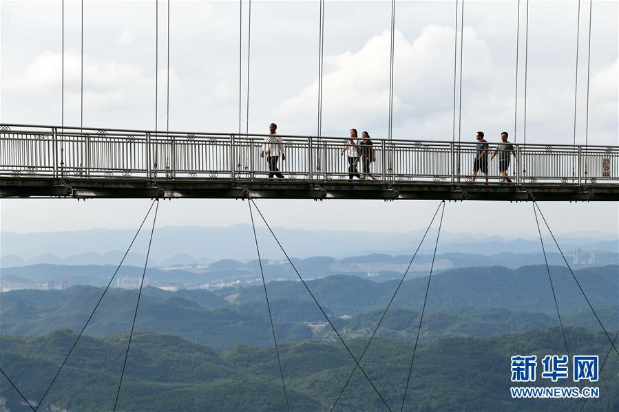 8月8日,游客在貴州省龍里油畫大草原的吊橋上觀光。近日,貴州省黔南布依族苗族自治州龍里縣境內(nèi)氣候宜人,龍里油畫大草原、“龍門鎮(zhèn)”武俠文化主題景區(qū)等景點吸引眾多游客前來觀光旅游。新華社記者楊文斌攝。