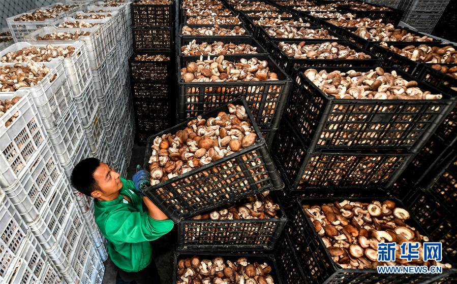 陜西漢中市留壩縣武官驛鎮(zhèn)留香益品商貿(mào)公司的員工在擺放冷庫里的香菇(7月2日攝)。陜西留壩縣是陜西西南部的特色農(nóng)業(yè)產(chǎn)業(yè)縣,近年來在推進產(chǎn)業(yè)富民的過程中,開辟出一條“政府+龍頭企業(yè)+扶貧社+農(nóng)戶”的訂單產(chǎn)業(yè)發(fā)展道路,把農(nóng)戶綁在產(chǎn)業(yè)鏈上,持續(xù)帶動農(nóng)業(yè)增效、農(nóng)民增收。新華社記者劉瀟攝。