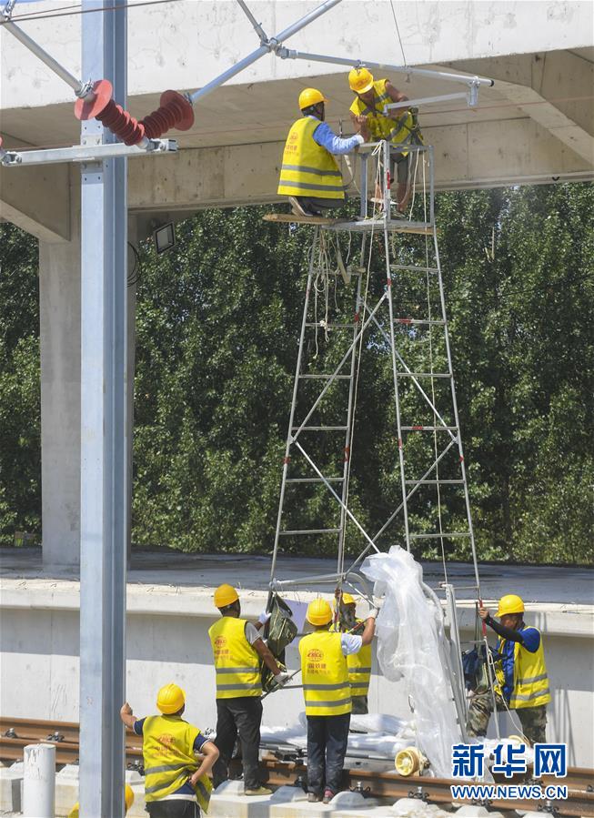 8月10日,工人在京雄城際鐵路霸州北站建設(shè)工地為接觸網(wǎng)卡定位。京雄城際鐵路霸州北站站臺(tái)雨棚混凝土結(jié)構(gòu)施工日前全部完成,目前霸州北站已全面轉(zhuǎn)入裝飾裝修和機(jī)電安裝階段,預(yù)計(jì)2020年底投入使用。京雄城際鐵路是連接北京市區(qū)、大興機(jī)場(chǎng)和雄安新區(qū)的重要干線(xiàn)。建成后,將進(jìn)一步完善京津冀區(qū)域高速鐵路網(wǎng)結(jié)構(gòu),便利沿線(xiàn)群眾出行,對(duì)于推動(dòng)京津冀協(xié)同發(fā)展和支撐建設(shè)雄安新區(qū)具有重要意義。新華社記者李曉果攝。