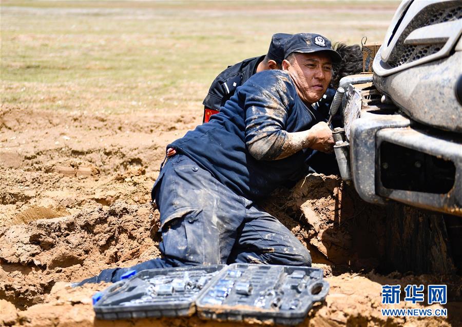 7月6日,卓乃湖保護(hù)站站長(zhǎng)秋培扎西在可可西里地區(qū)修理車(chē)輛。新華社記者張龍攝