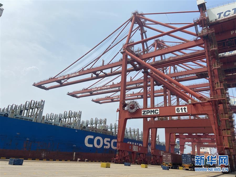 貨車在天津港集裝箱碼頭等待直提貨物(8月4日攝)。新華社記者張宇琪攝