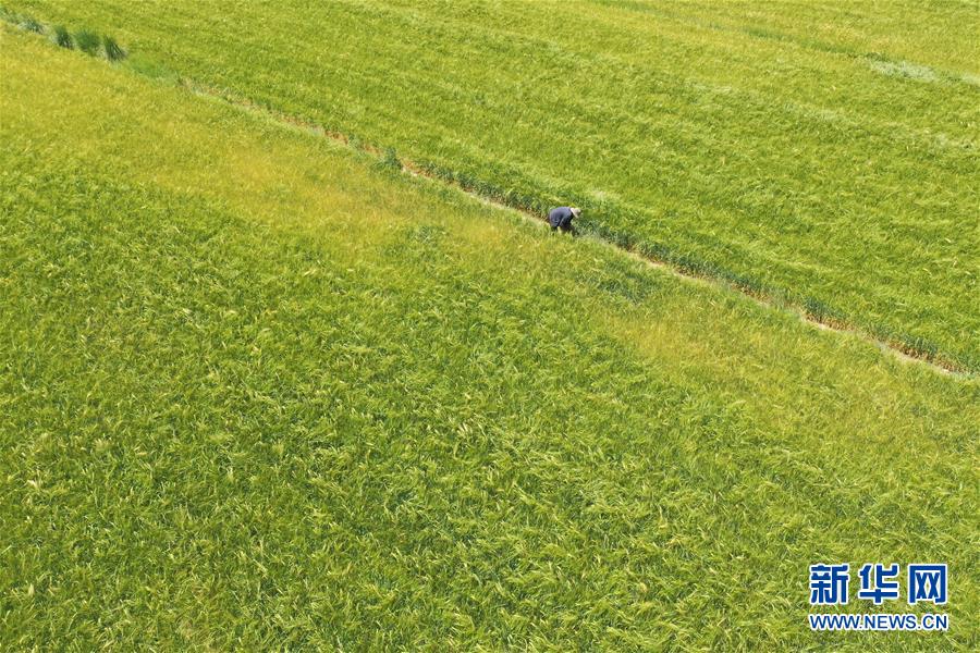 甘肅省金昌市永昌縣下四壩村村民徐文國(guó)在地里勞作(7月10日攝,無人機(jī)照片)。新華社記者 杜哲宇 攝