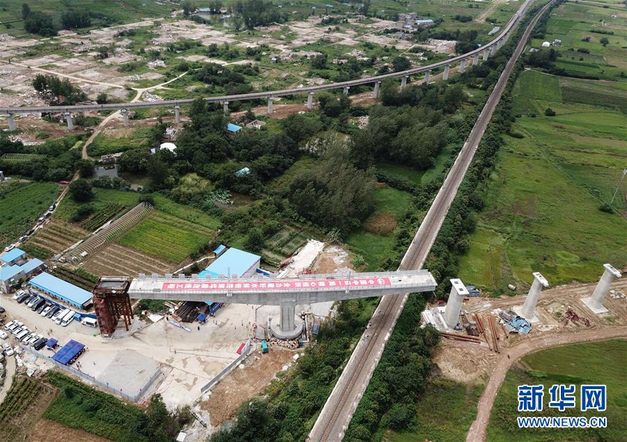這是8月12日拍攝的水蚌鐵路蚌埠段改線工程東站疏解線特大橋跨越京滬鐵路上行線轉體梁轉體施工現(xiàn)場(無人機照片)。當日,由中鐵一局承建的水蚌鐵路蚌埠段改線工程東站疏解線特大橋跨越京滬鐵路上行線64米T構轉體梁成功實現(xiàn)轉體。新華社記者 劉軍喜 攝