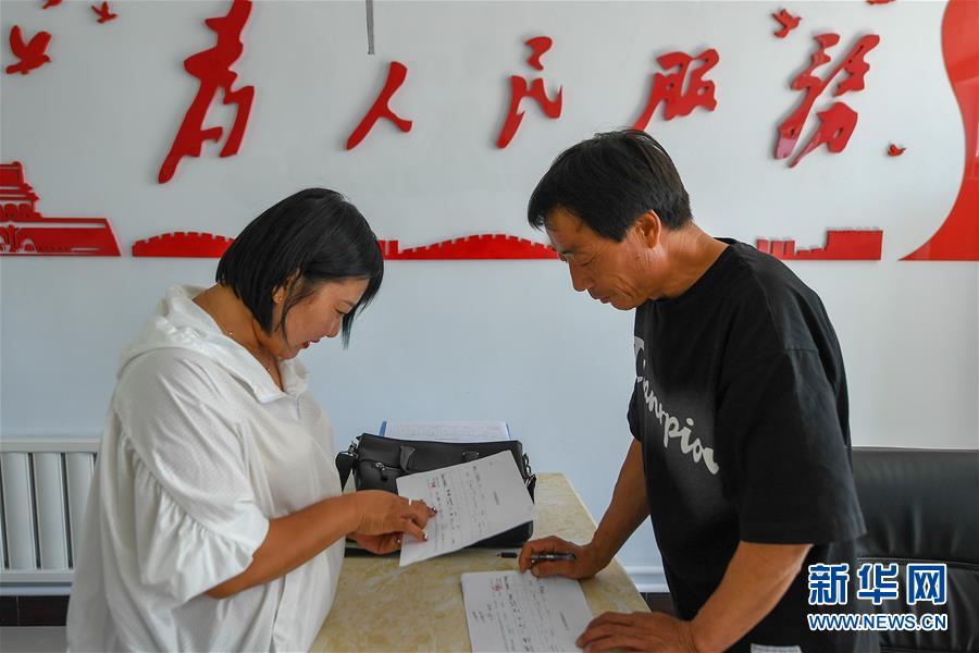 8月12日,在鎮(zhèn)賚縣黑魚(yú)泡鎮(zhèn)岔臺(tái)村,村民包春苗(左)在便民服務(wù)大廳辦業(yè)務(wù)。新華社記者 張楠 攝