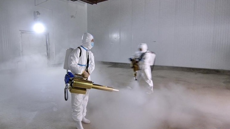 7月14日,北京二商肉類食品集團(tuán)有限公司員工在對肉類運(yùn)輸車輛??繀^(qū)域進(jìn)行防疫消毒。