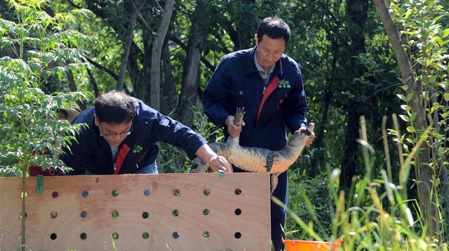 5月20日,安徽揚子鱷國家級自然保護區(qū)在安徽多地同時放歸揚子鱷,當(dāng)天共放歸人工繁育揚子鱷32條。