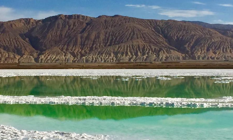 在青海柴達(dá)木盆地最西部的茫崖有一處硫酸鎂亞型人工鹽湖,以其翡翠綠色的鹽田與藍(lán)天白云和附近的丹霞地貌相映。