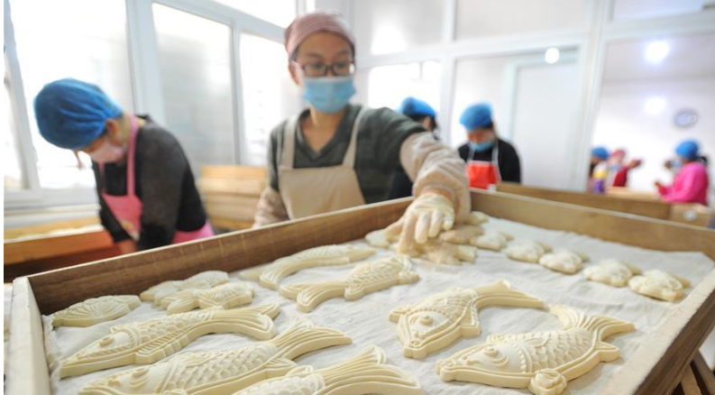 1月31日,河北黃驊市一家面花作坊的工人在查看面花。春節(jié)前夕,當?shù)孛婊ㄖ谱鞴S加班加點制作面花,供應(yīng)春節(jié)市場。