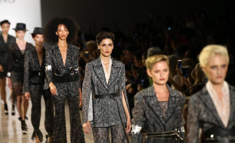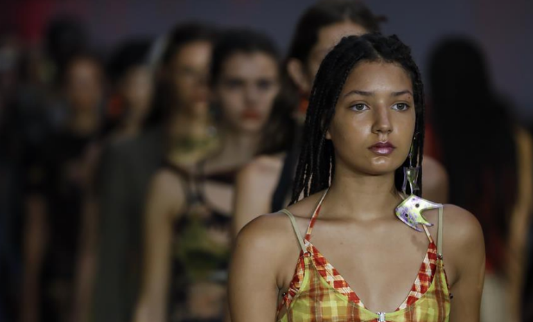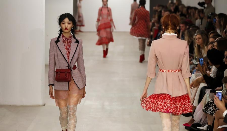 9月17日,在英國(guó)倫敦,模特在2020倫敦春夏時(shí)裝周上展示Charlotte Knowles品牌服飾(多重曝光)。