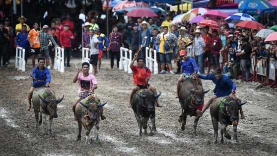 當(dāng)?shù)貢r(shí)間2019年10月12日,泰國(guó)春武里舉行一年一度的水牛賽跑,選手騎??癖肌?/p>