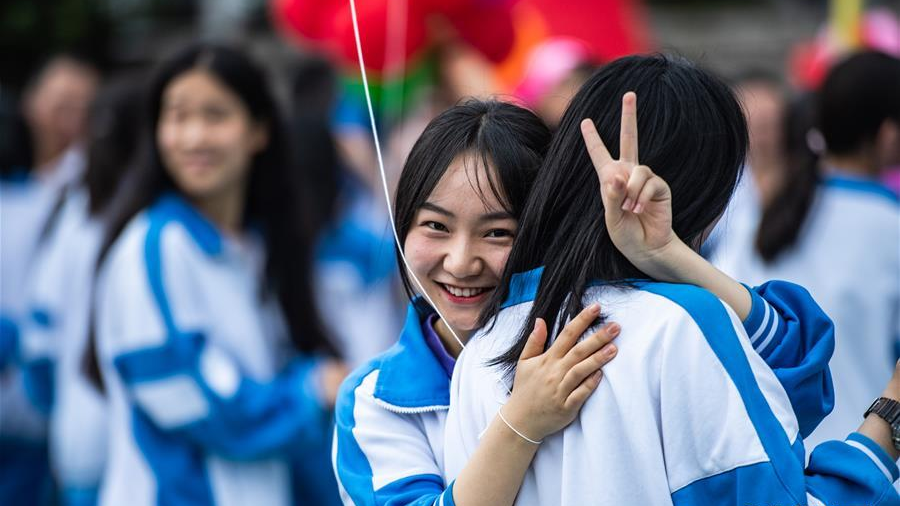 6月27日,烏當(dāng)中學(xué)高三學(xué)生在畢業(yè)典禮上和同學(xué)擁抱。