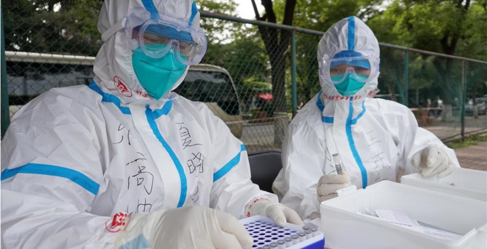 6月15日,北京市豐臺區(qū)東高地街道采樣點工作人員在進(jìn)行采樣工作。