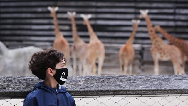 6月9日,一名男孩在法國巴黎動物園內(nèi)參觀長頸鹿。受新冠疫情影響關(guān)閉了近3個月的巴黎動物園于8日重新開放。